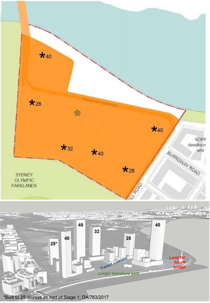 The delivery of a new Parramatta River bridge which could facilitate a light rail corridor is being considered as part of the State Planning Agreements with other property owners/applicants for the proposed development areas within Melrose Park on the north side of Parramatta River. The Sekisui site provides land which may be used to facilitate the bridge in future and will assist in delivering a better public transport outcome for Wentworth Point residents in the future. |