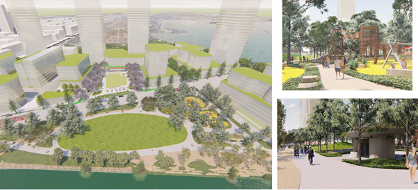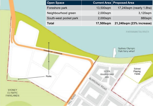 The proposal provides for an increase in open space of 23% compared to the existing approval for the site. The new foreshore park area expands the 1.35ha zoned area to a minimum of 1.72ha.. In addition, there will be 2 pocket parks within the site equal to 4,000sqm that will be held under community title but will be publicly accessible. Acquisition and embellishment of the foreshore park are included as part of the draft Planning Agreement with the applicant. |