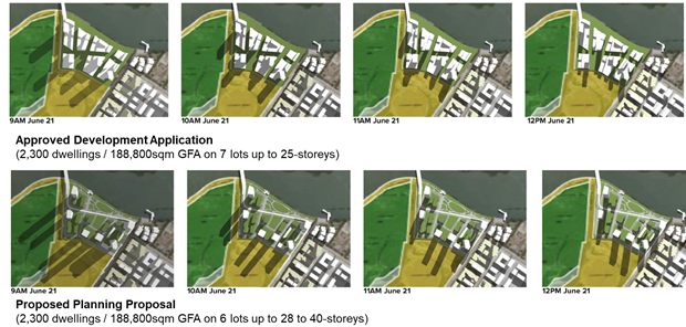 The overall impact of overshadowing will be similar to the existing approval (although, only part built) because there is already approval for 2,300 apartments on the site. The extent of shadowing will differ and changes from shallow slower-moving shadows into longer faster-moving shadows cast from a taller more slender built form. This will provide more permeable solar access for residential dwellings and surrounding parklands.